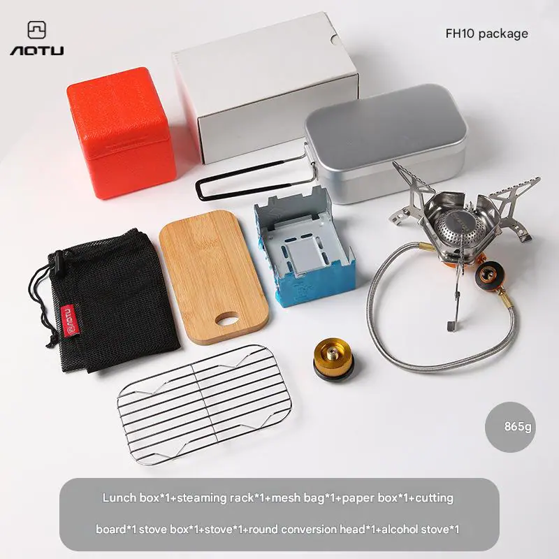 SKU10: Lunch box * 1 + Steaming rack * 1 + Small German alcohol stove * 1 + Bamboo cutting board * 1 + Stove head * 1 + Round conversion head * 1 + Mesh bag * 1 + Paper box * 1 Weight: 865g