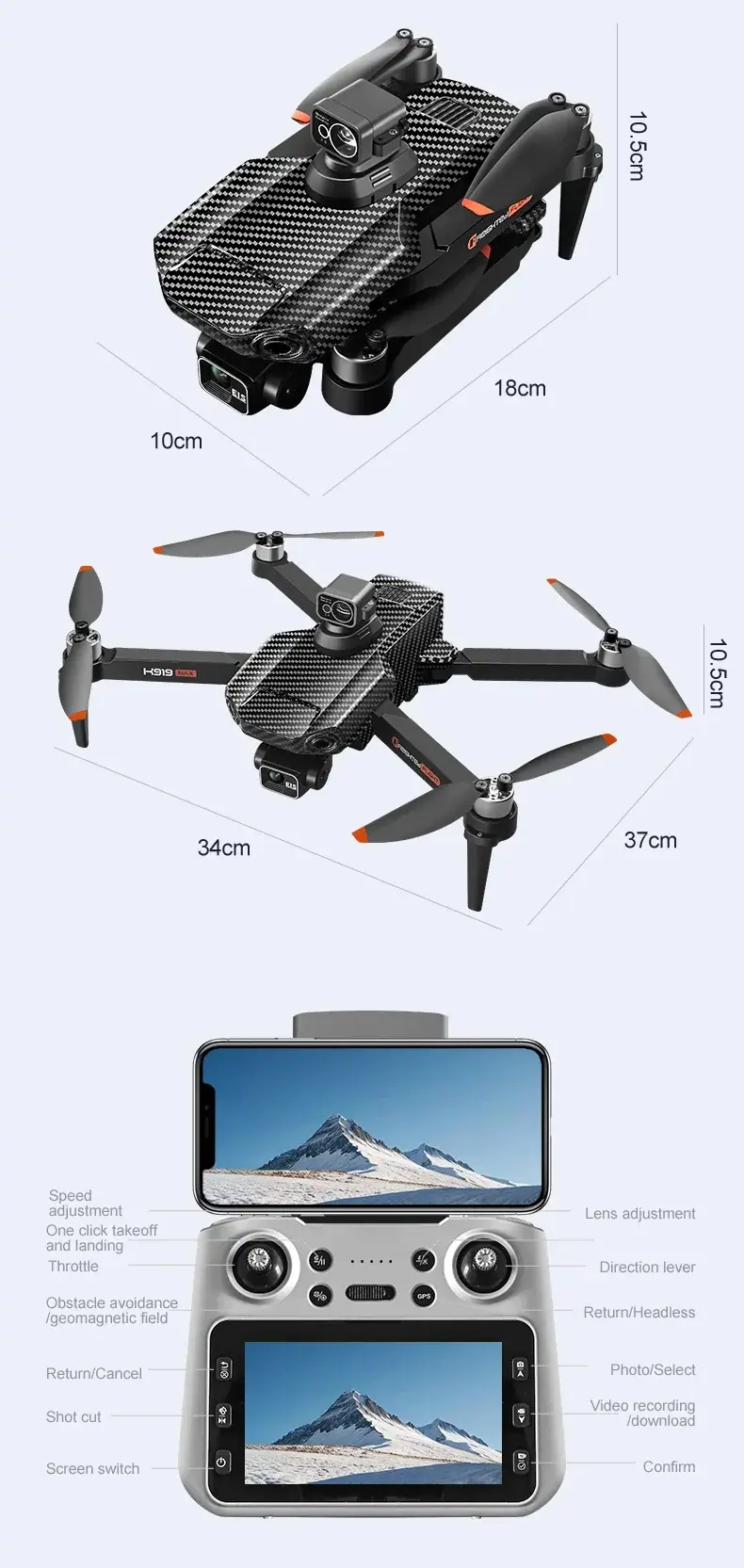 Drone size: unfolded 37*34*10.5CM, folded 18*10*10.5CM