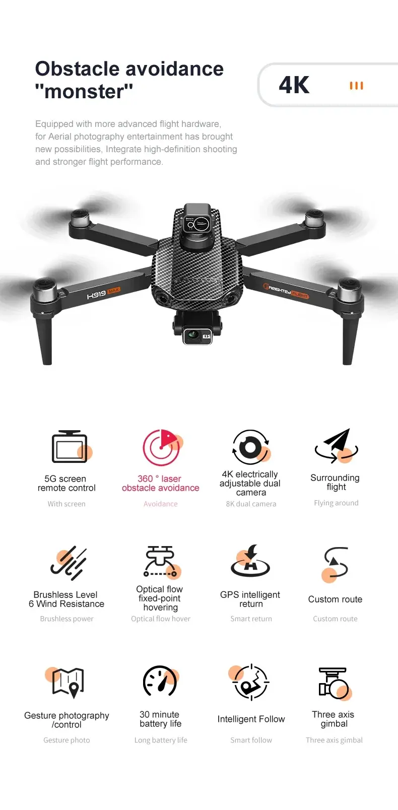 4191-ដ្រូន K919 max Drone 4K Professional HD Camera 3-Axis Gimbal With Touch Screen Laser/infrared Obstacle Avoidance Brushless Drones Toy
